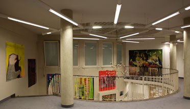oben im Bild Lilli Eberle in ihrer Kunstberatungsstelle, vor einer Arbeit von Daniel Kiss